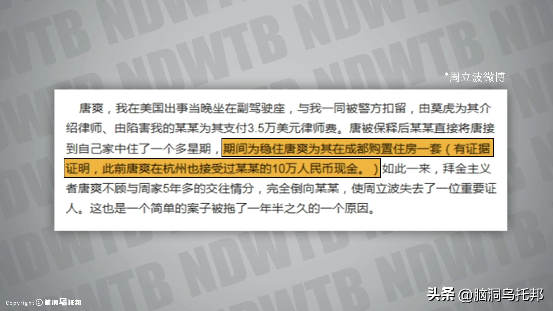 周立波还在网上散布过一种言论称,唐爽被某某收买了,说某某在杭州给了唐爽10万块钱,还在唐爽的老家曾给唐爽买了一套房子。