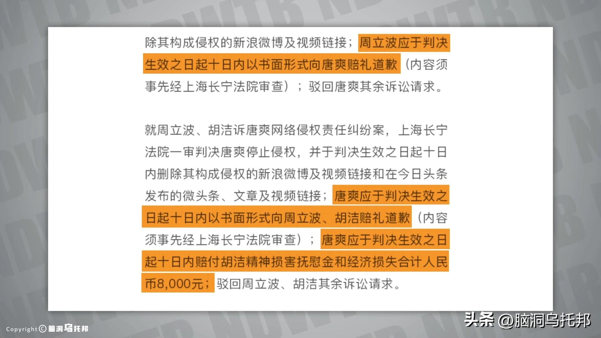 2020年3月,上海市长宁区人民法院一审判决双方相互停止侵权,并相互书面道歉。同时唐爽需赔付胡洁精神损害抚慰金和经济损失8000元。