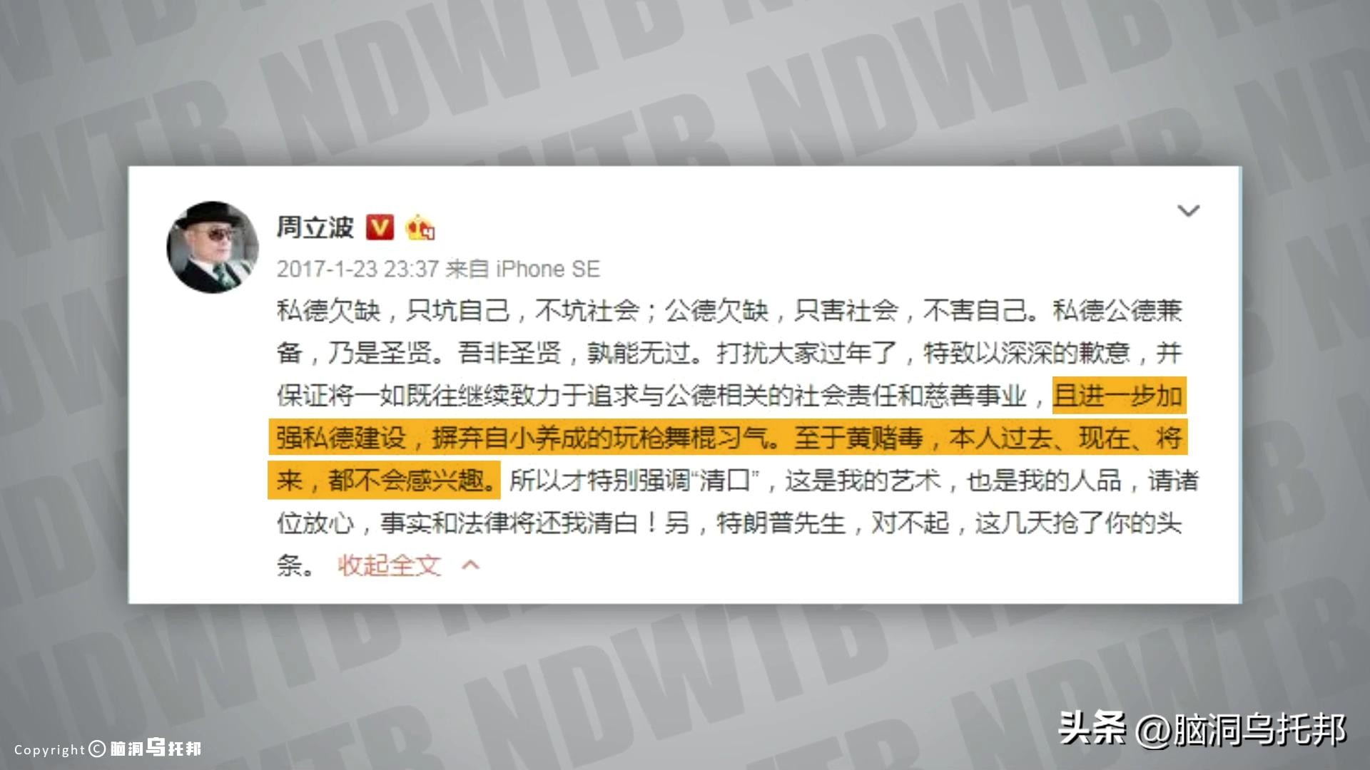1月23日,周立波赶紧发了微博道歉,称自己「将进一步加强私德建设,摒弃自小养成的玩枪舞棍习气。至于黄赌毒,本人过去、现在、将来,都不会感兴趣」。