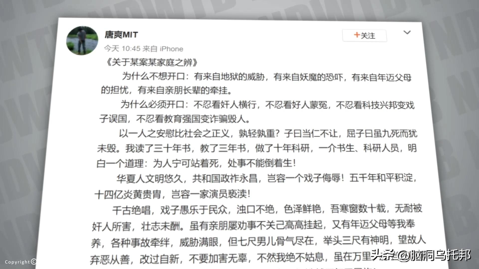 2018年7月7日上午,唐爽发布了长篇微博,称「为什么不想开口:有来自地狱的威胁,有来自妖魔的恐吓,有来自年迈父母的担忧,有来自亲朋长辈的牵挂。