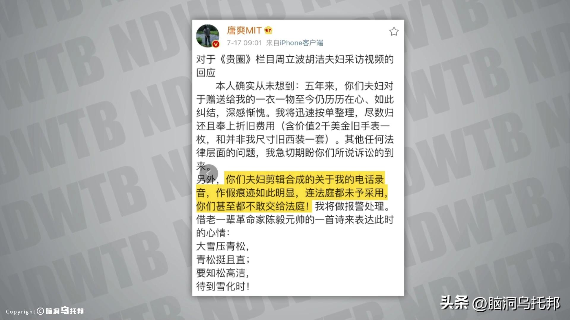 17日上午,唐爽发微博回击:你们夫妇剪辑合成的关于我的电话录音,作假痕迹如此明显,连法庭都未予以采用,你们甚至都不敢交给法庭!