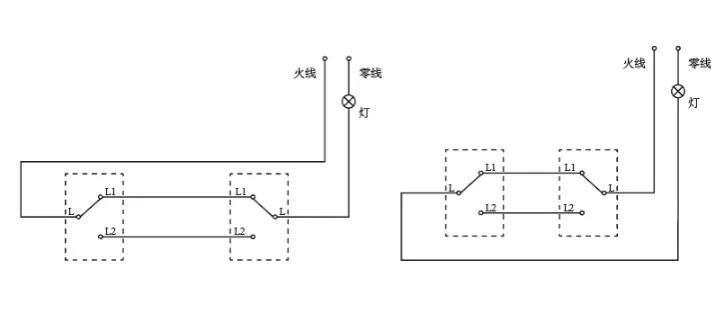 左边开关按下:L和L2接通,整个回路断开,此时灯熄灭。再按下右边开关时:L和L2接通,两个开关间,形成闭合回路,此时灯亮起。