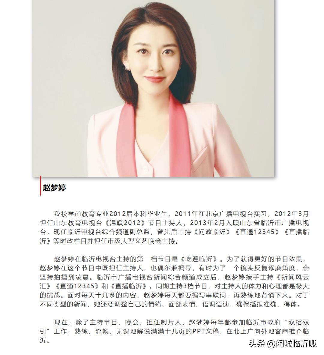 2022年四月十六日,时任临沂电视台综合频道副总监,曾先后主持《问政临沂》《直通12345》《直播临沂》等时政栏目并担任市级大型文艺晚会主持。