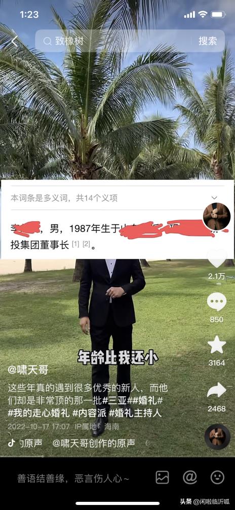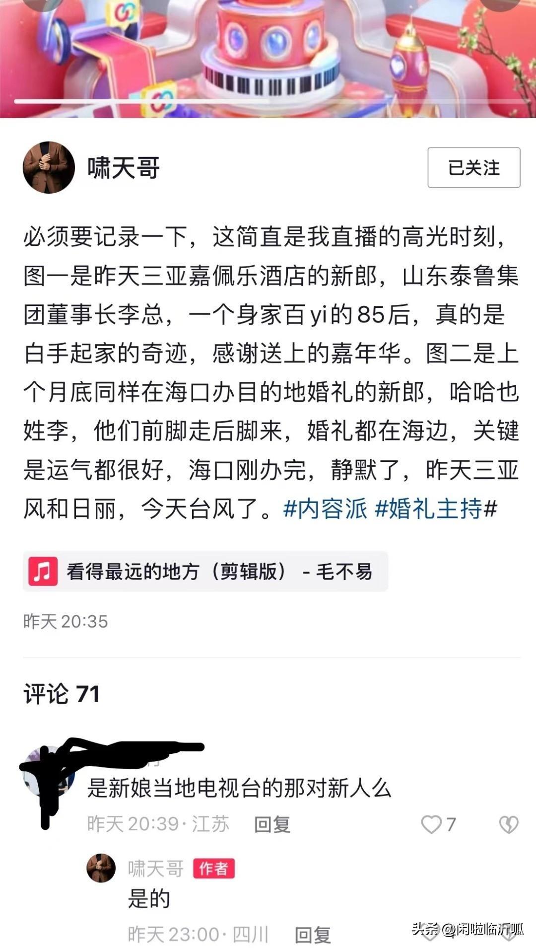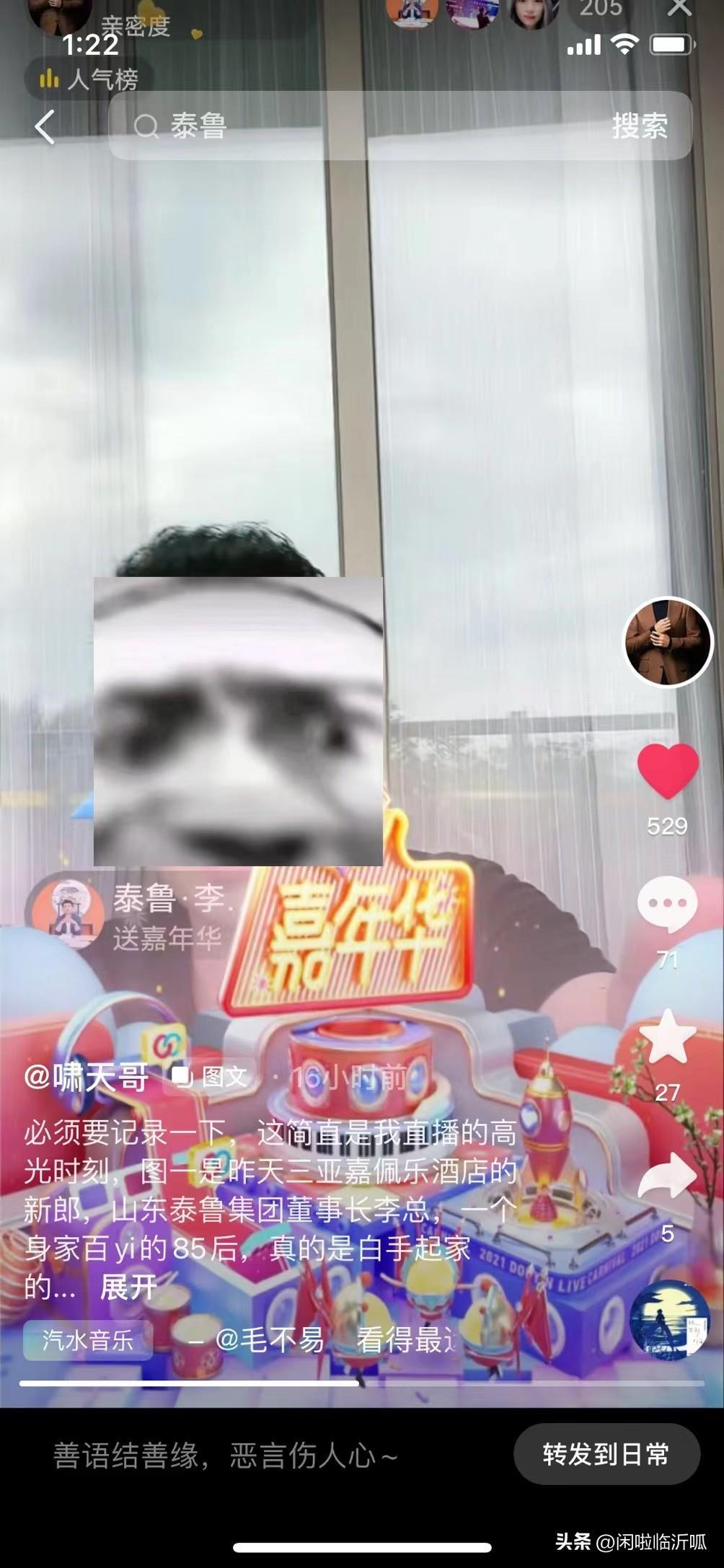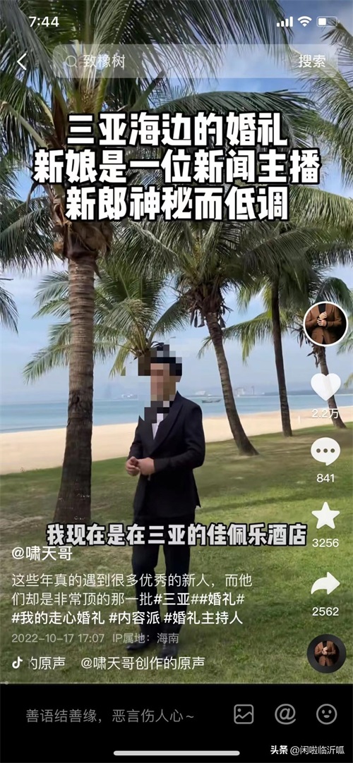 从图中得知刷嘉年华的正是泰鲁集团董事长李超群的社交平台账号,至于是否为泰鲁李超群本人操作,我们不得而知,而在另外一条视频中我们看到2022年10月17发布了一则“三亚海边的婚礼,新娘是一位新闻主播新郎神秘而低调”