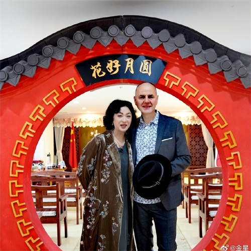 而最后一张照片,则是两人在中式的拱门前微笑面对镜头,汉斯摘下了帽子,西装笔挺,金星则依偎在丈夫身旁微微笑,幸福满满。