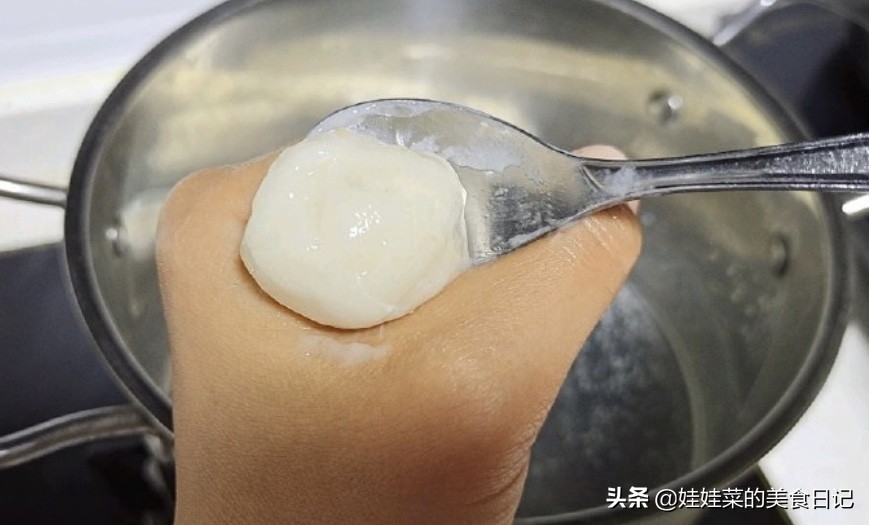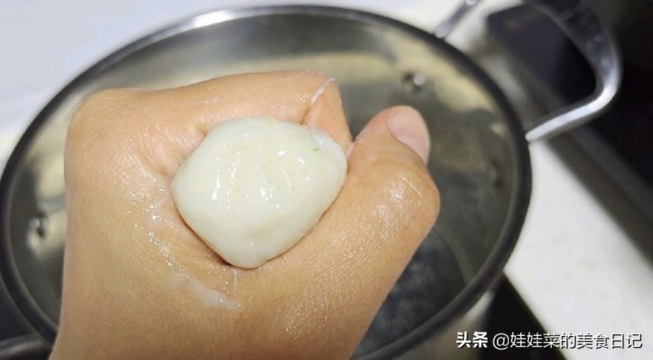 勺子蘸水,从虎口处舀一下,丸子就成型了。