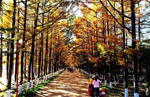漫步其中,笔直的大道上金黄的松针与蓝天、白云和周围绿色植物共同构成了一幅美丽的画卷,恣意淌入眼帘。