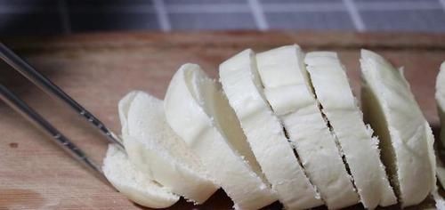 1、现咱们将新鲜的馒头两个用推拉刀法将其慢慢的切成薄片备用。大家注意。切馒头,面包等这些发面制品,大家一定要用推拉刀法,也就是用刀一推一拉的切,这样才会切的整齐好看,而且也不会掉馒头屑,这一点咱们大家要牢记。