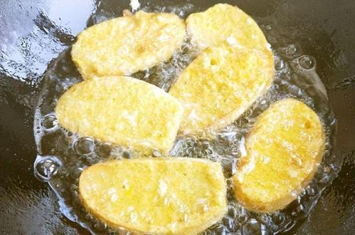 2、接着,咱们直接锅烧热油,开始制作,大家注意,咱们很多朋友,在炸软炸馒头片的时候,经常把鸡蛋打入盘中先搅匀,再将切好的馒头放入锅内,然后再炸。其实这种做法是错误的,这样鸡蛋经过打发后,在炸制的时候就不会起泡了,而且蛋液会渗到馒头中,就炸不出馒头片外面裹着一层鸡蛋的口感了,这一点,咱们大家一定要注意。