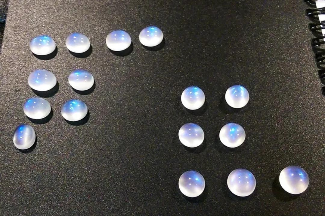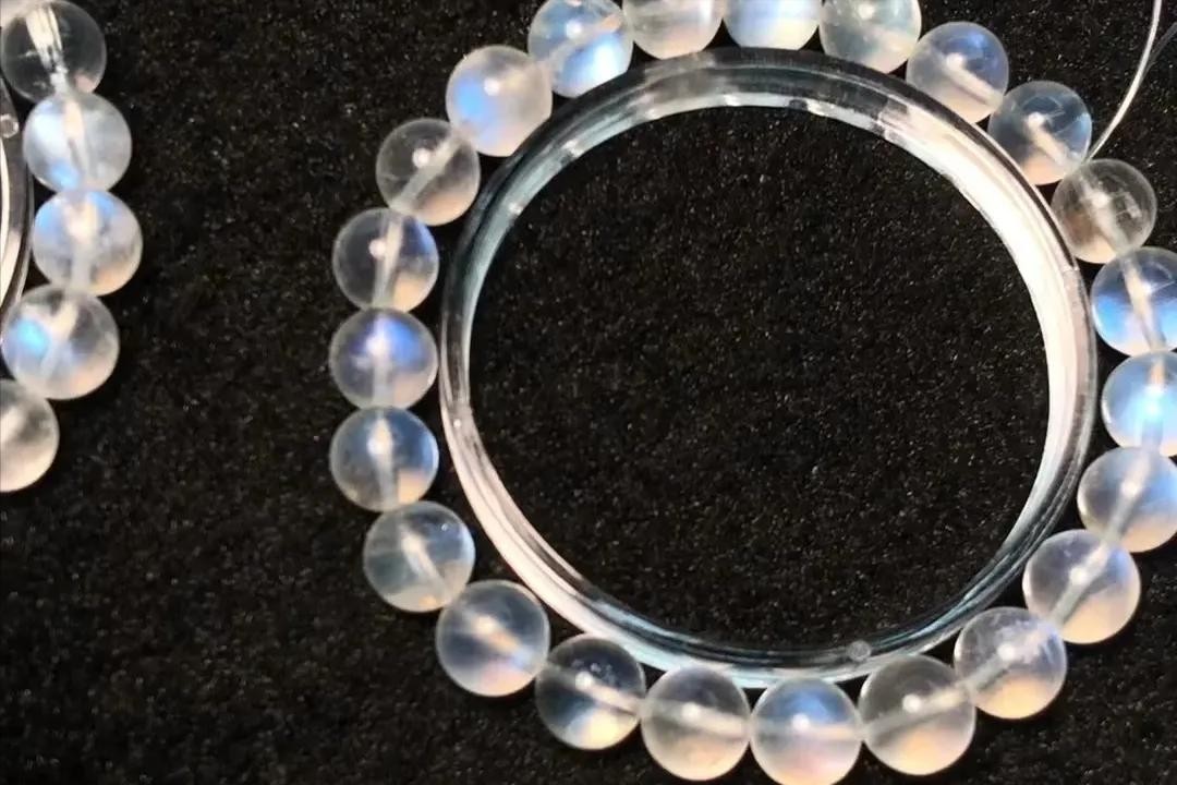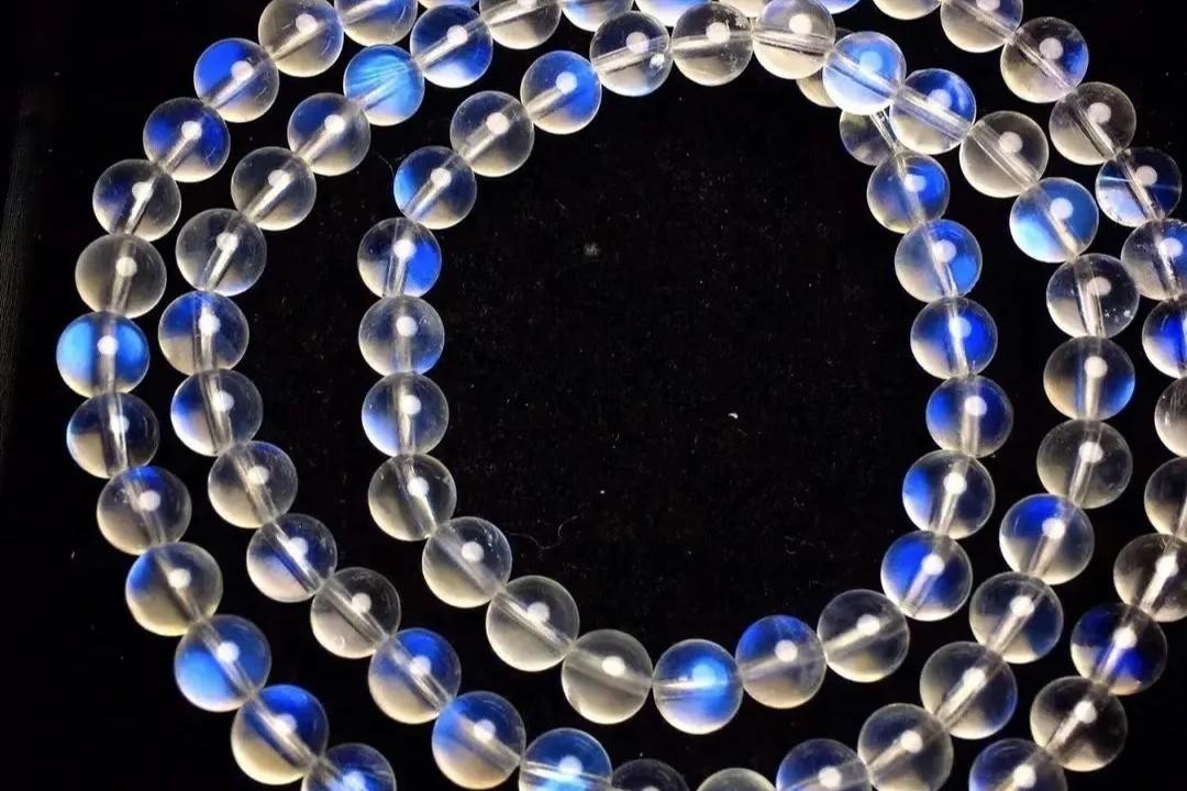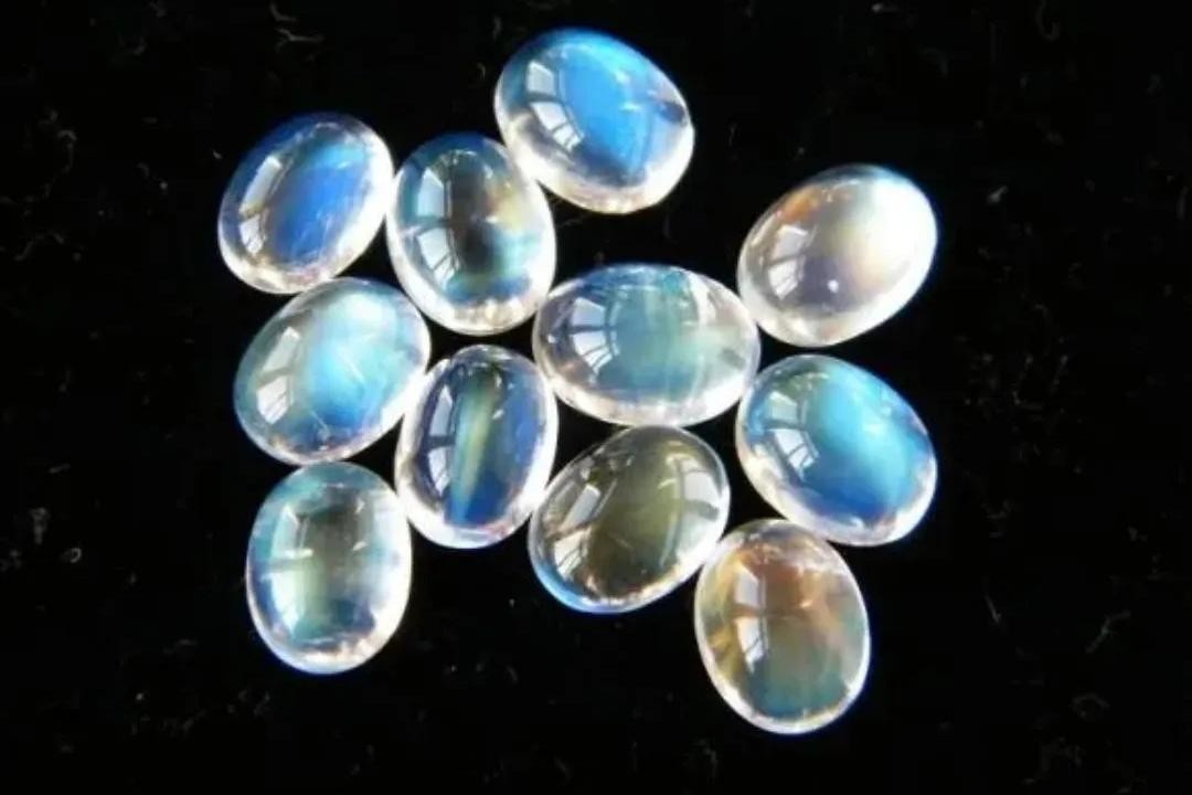 由于月光石内部有许多平行结晶薄片,当白色的光照到宝石上,会互相映射而表现出浅蓝色、浅黄白色的干涉色晕彩,仿佛朦胧如月光。