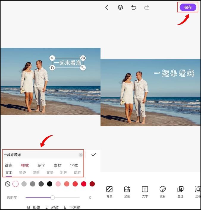 对文字的样式、字体、颜色、大小等都是可以设置的,非常方便,完成后将图片保存到手机上即可。