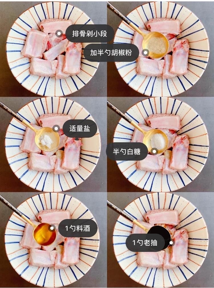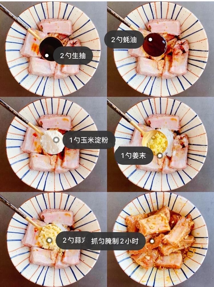 排骨剁小段+半勺胡椒粉+适量盐+半勺糖+1勺料酒+1勺老抽+2勺生抽+2勺蚝油+1勺玉米淀粉+1勺姜末+2勺蒜末,抓匀腌制2小时