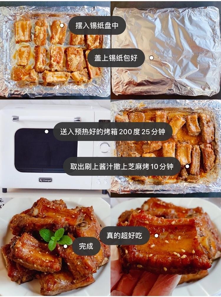 腌好的排骨摆到铺了锡纸的烤盘上,再盖上一层锡纸包好,送入预热好的烤箱,200度烤25分钟。