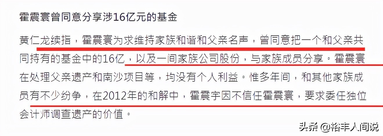 此后的时间里,霍震寰为了维持家族的和谐以及父亲的名声,曾同意把一个和父亲共同持有的基金中的16亿,以及一个家族公司的股份,与家族成员分享,但在2012年的和解中,霍震宇因不信任霍震寰,要求委任独位会计师调查遗产的价值。