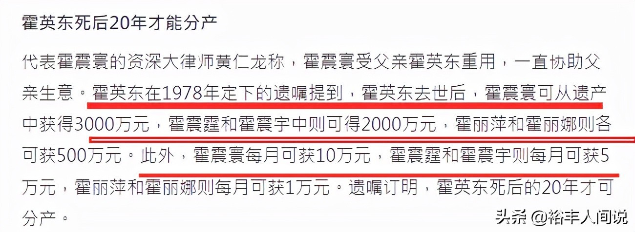 1978年霍英东立下遗嘱,在其去世后,霍震寰可以从遗产中获得3000万,霍震霆和霍震宇为2000万,霍丽娜、霍丽萍500万,此外,霍震寰可以每月获得10万,霍震霆与霍震宇每月5万,霍丽娜和霍丽萍每月1万,这份遗嘱必须在其死后20年才可以进行瓜分,但相关的财产分割并没有写进遗嘱。