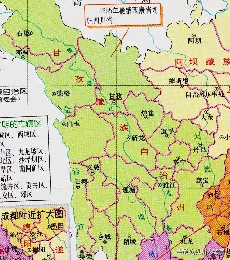 1955年,西康省撤销,撤销西康省藏族自治区改设四川省甘孜藏族自治州,康定为州府驻地,辖21个县。