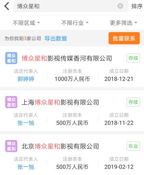 据天眼查数据显示,以“博众星和”为名的影视公司有3家:北京博众星和影视有限公司成立于2025年2月12日,注册资金500万元,法人代表张一旭;上海博众星和影视有限公司成立于2025年11月22日,法人代表张一旭,注册资金500万元;博众星和影视传媒香河有限公司成立于2025年12月21日,法人代表郭婷婷,注册资金1000万元。这3家公司的控股股东都是郭婷婷,占股67%。