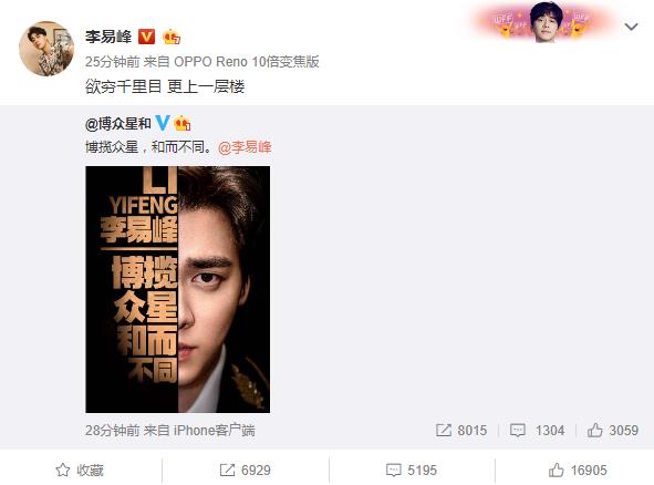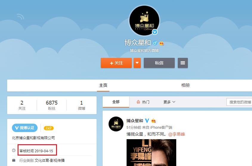 而且,博众星和官方微博审核通过时间是4月15日,今天是其开通第一天,目前只发了这一条微博,只关注了李易峰和壹峰信两个微博用户。“壹峰信”是李易峰工作室官方微博。据此推测,“博众星和”或许是李易峰自己的公司。有网友也留言询问李易峰此事。