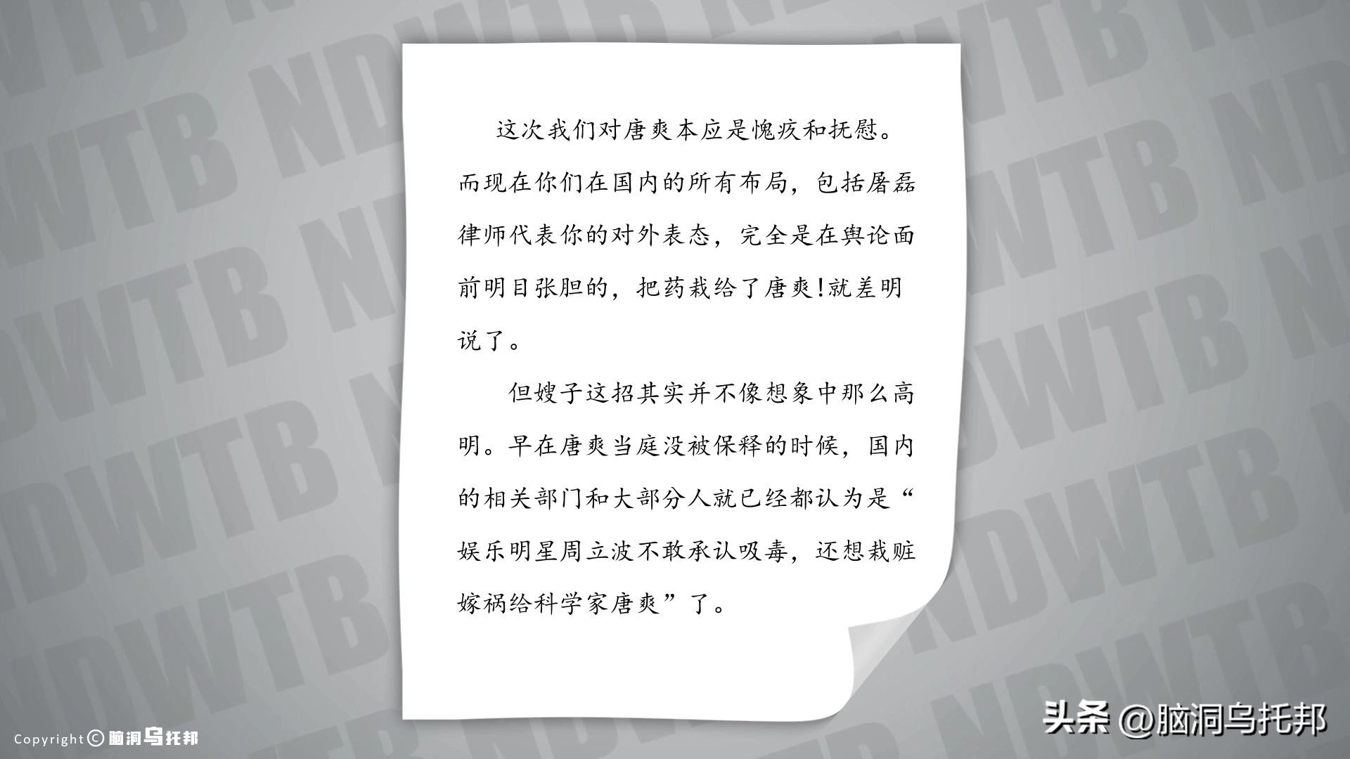 而现在你们在国内的所有布局,包括屠磊律师代表你的对外表态,完全是在舆论面前明目张胆的,把药栽给了唐爽!就差明说了。