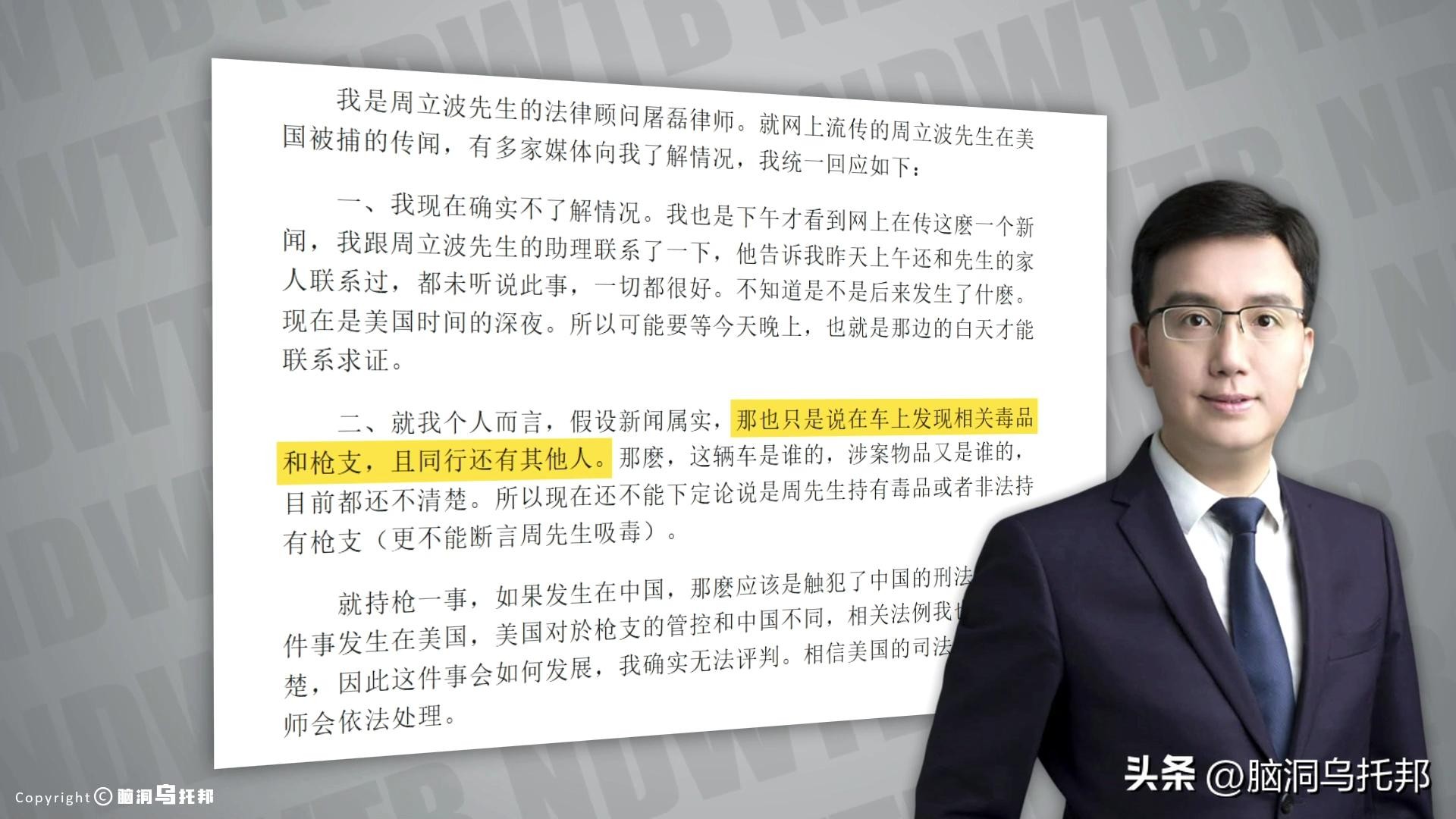 结果是周立波先被保释了出去,随后通过其国内律师屠磊发言称「车上发现了枪支和违禁品,且同行还有其他人」,似乎是在暗示问题出在仍没被保释的唐爽身上。