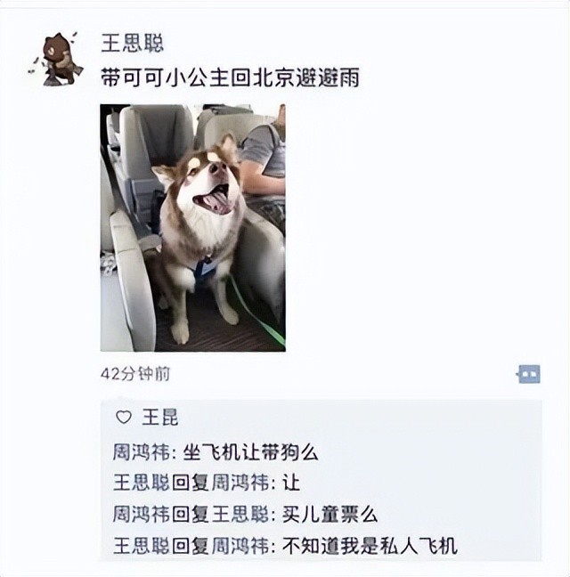 2017年7月,王思聪发朋友圈称,带自己的爱犬可可小公主回北京避雨,照片显示一只狗狗在飞机的座位上。