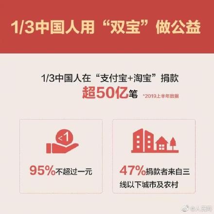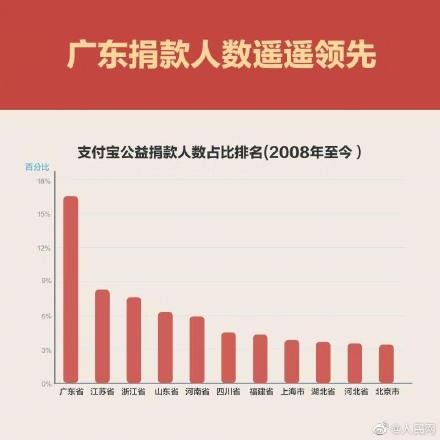 【中国网友半年公益捐款18亿 80后90后成公益捐赠主力】民政部统计表明,2019年上半年,中国网友通过支付宝等互联网公益平台累计捐款超过18亿元。据支付宝公益平台数据显示,95%的善款不超过一元,广东省捐款人数占比高居榜首,80后90后成为捐赠主力,98%善款用于扶贫帮困。今年你贡献了多少爱心?