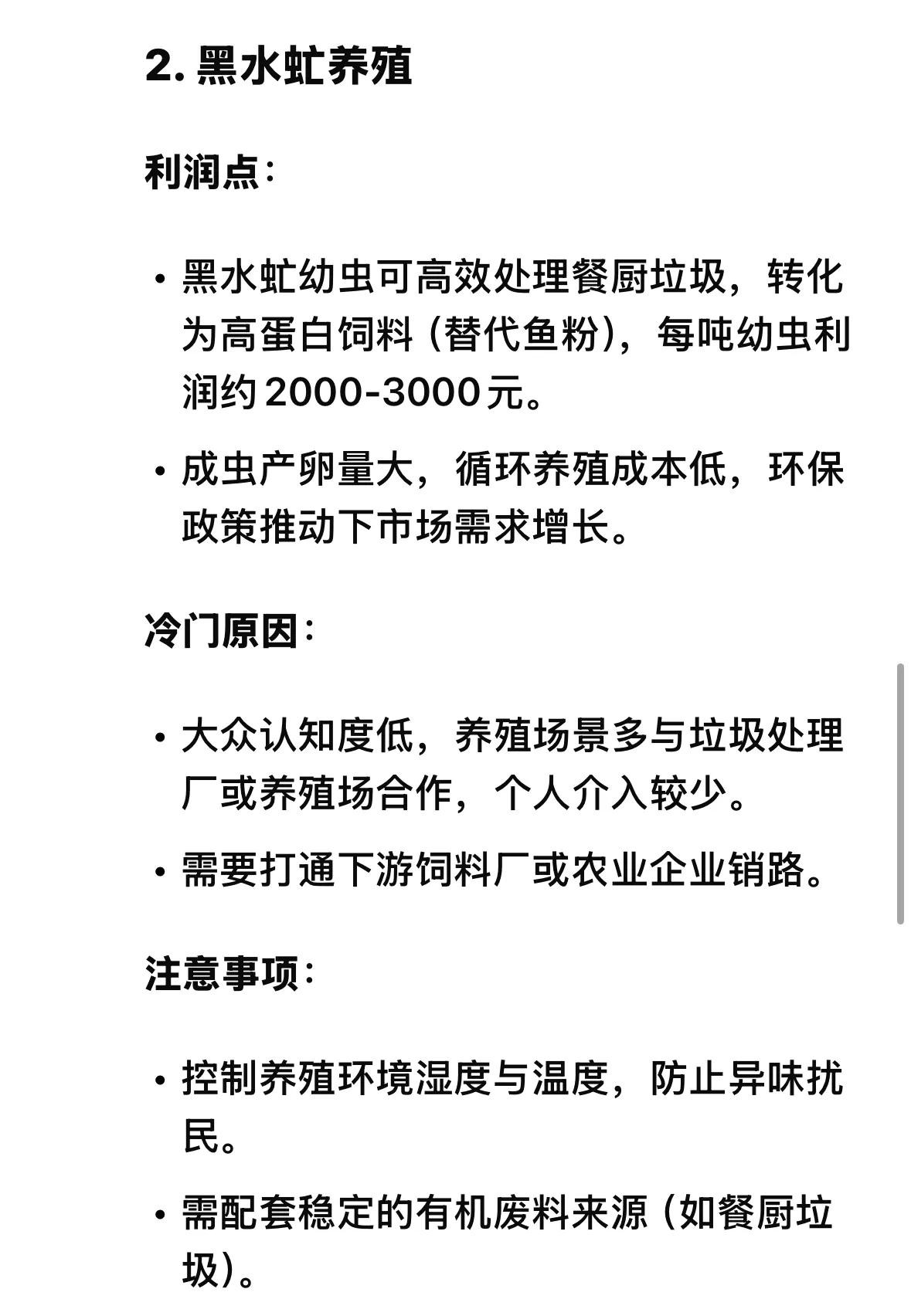 以下是三个相对冷门但可能具有较高利润潜力的养殖项目,但需注意,任何投资都存在风险,务必结合市场调研、技术掌握和合法合规性进行综合评估