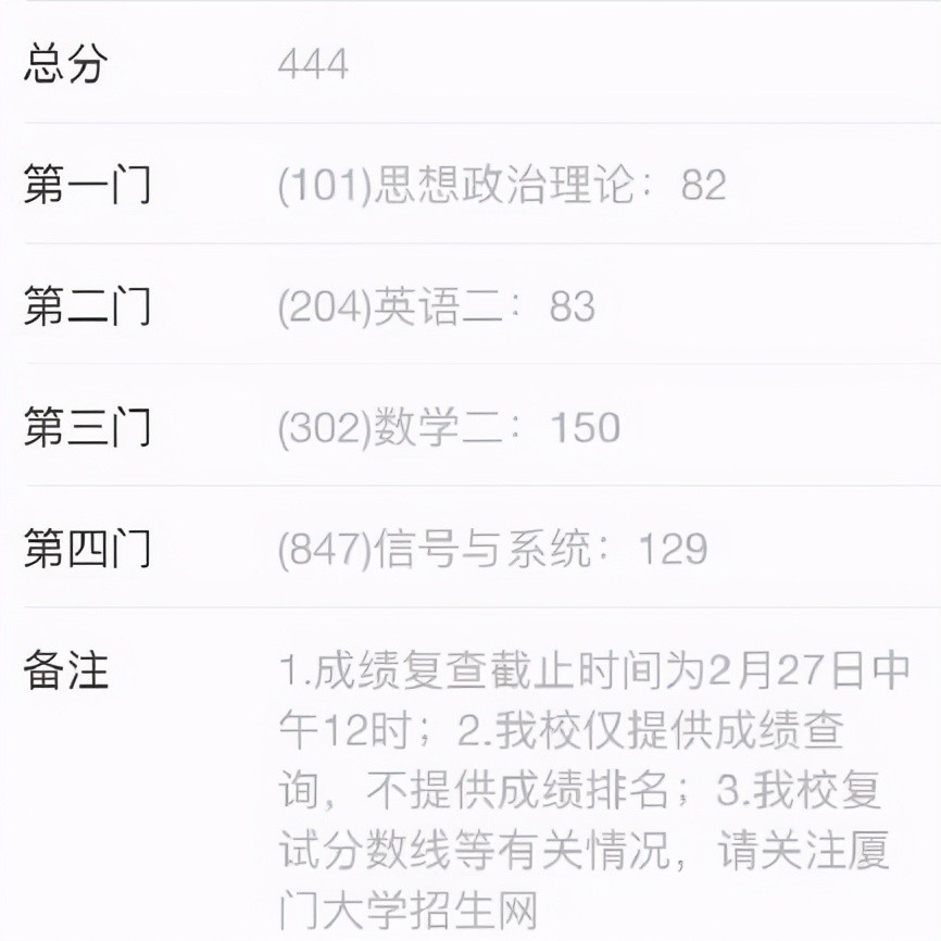 其次是来自厦门大学的某同学,考研成绩是444的高分,真是太牛了。