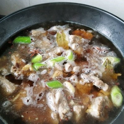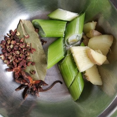 4、葱、姜、八角、花椒、香叶提前备好