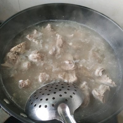 3、排骨冷水下锅,煮出血沫,开锅8分钟,捞出,用冷水冲洗干净