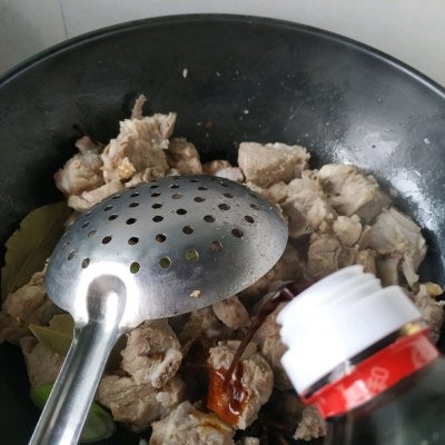 5、锅中放油,油温八成热放入排骨翻炒,然后放入提前准备好的香料,倒入料酒,酱油,翻炒