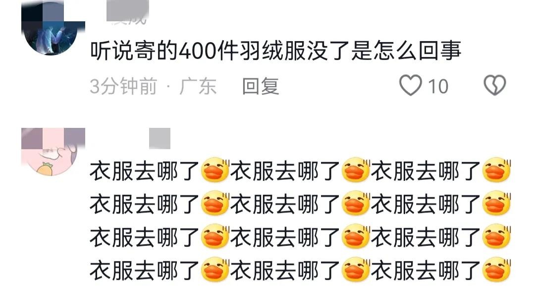 有网友建议:不如直接走法律途径。但捐赠人杨女士表示:关于此事并没有选择报警,还是邮政局把衣服找回来或者找出爱心发放的证据,如果找不回衣服也没有证据能证明是当做爱心物资发放,则照价赔偿,而赔付的钱继续购买物资捐赠给灾区。