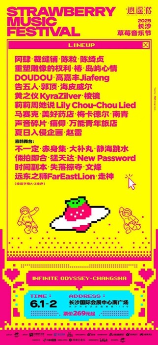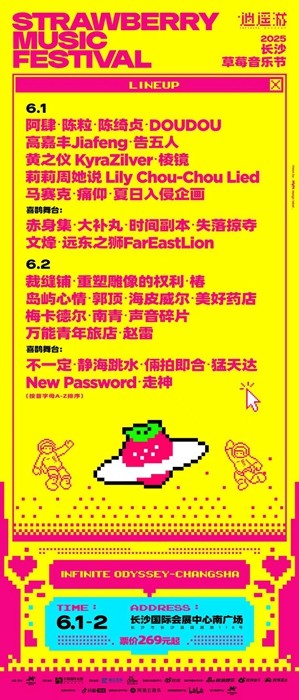 4月8日,2025长沙草莓音乐节官宣今年的阵容和亮点。今年,草莓音乐节将载着“逍遥游”的主题,带来了更多元的本地化尝试与音乐边界探索。两天36组艺人参演,分草莓舞台、爱舞台、以及全新设立的喜鹊舞台,三大舞台演出,汇聚流行、摇滚、电子、实验与在地声音,让长沙的“躁”不止于烈日。