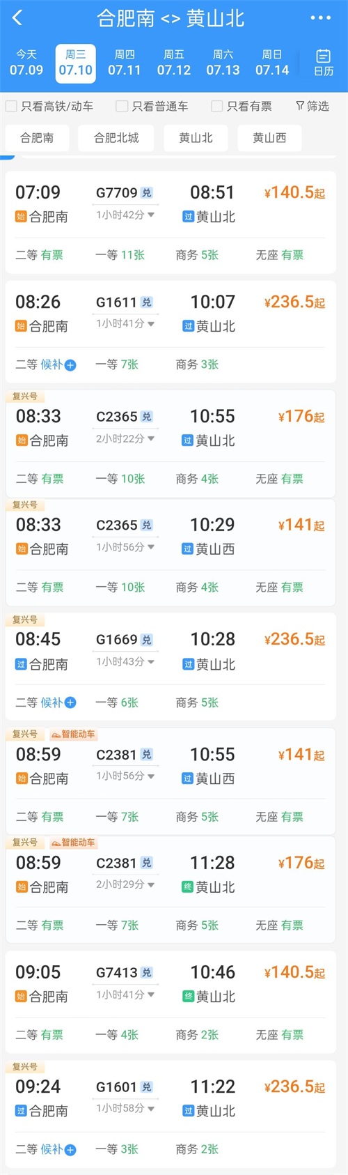 记者查询发现,7月10日,也有多趟合肥南直达黄山北站列车二等座无票(候补)现象。