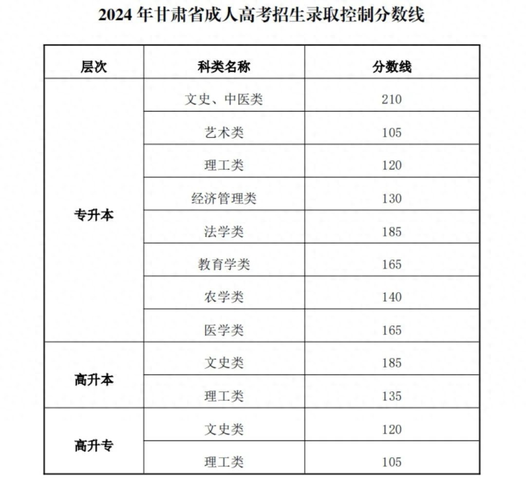 附件:2024年甘肃省成人高考招生录取控制分数线