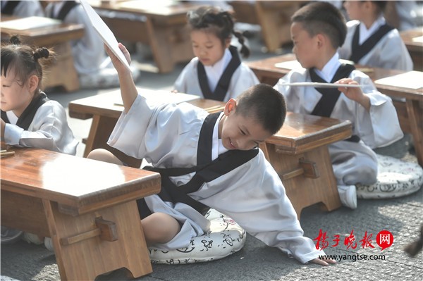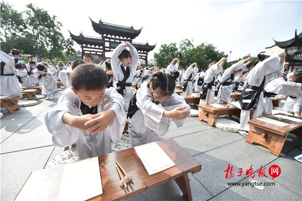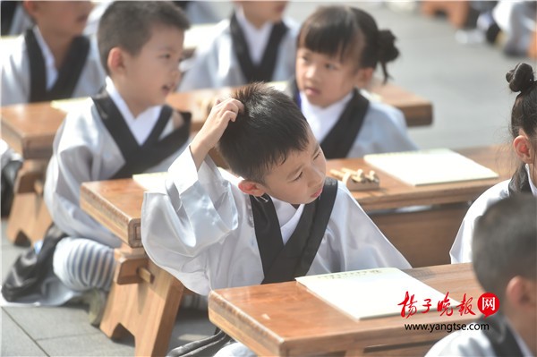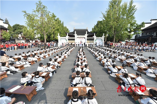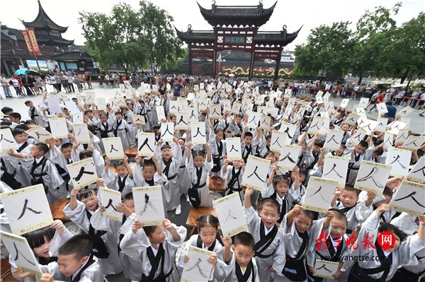 2018年9月2日,南京市,夫子庙小学百日成长系列课程——星星娃第一礼“开笔礼”仪式在夫子庙广场隆重举行,200多名小萌娃成为“孔子门生”。作为“离孔子最近的学校”,南京夫子庙小学举行开笔礼活动已经13年了。
