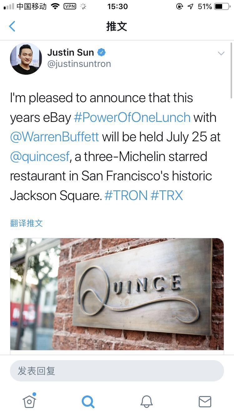 定了!巴菲特与孙宇晨将于7月25日在旧金山餐厅共进午餐