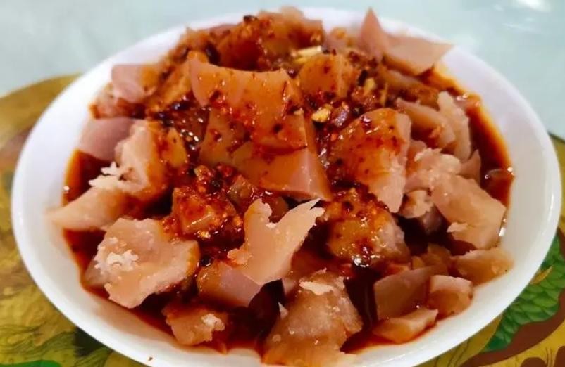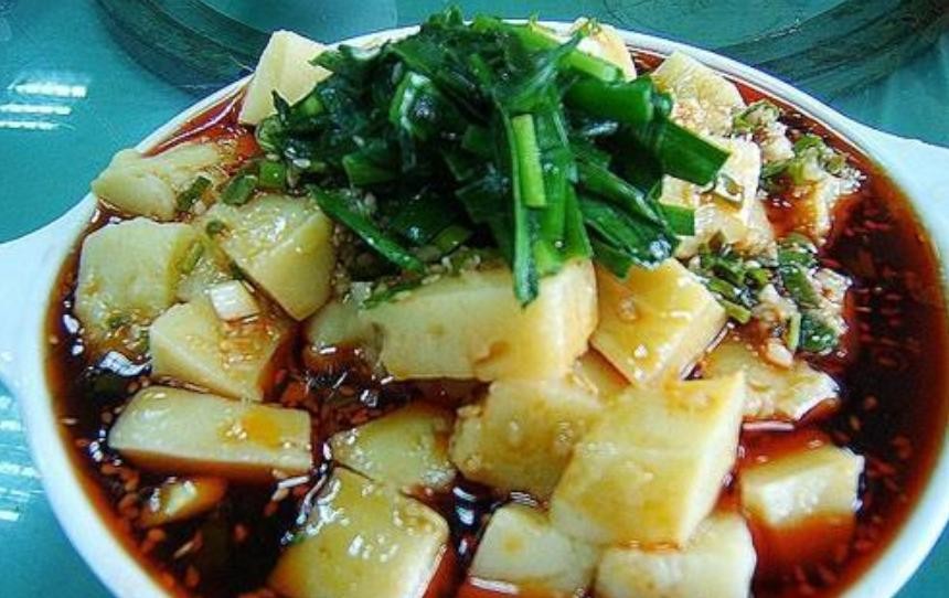 制作时,将荞麦粉加水和成面团,放入锅中煮熟后,切成小块,加入辣椒油、醋、盐等调料即可。