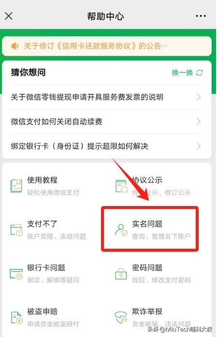 3、在帮助中心页面中,点击“实名问题”选项,然后点击选择“查询名下账户”选项。