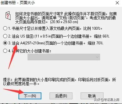 按下面提示进行打印是第一种情况:打印好后A3短边对折,订书钉往中间一订就是A4的书册,而且内容顺序不会乱。需要注意的是A3纸打印时,选横向双面,短边装订。(因打印机型号多种,有些型号的打印机可能不是上面描述的,但设置按“横向双面,短边装订”的意思设置)。