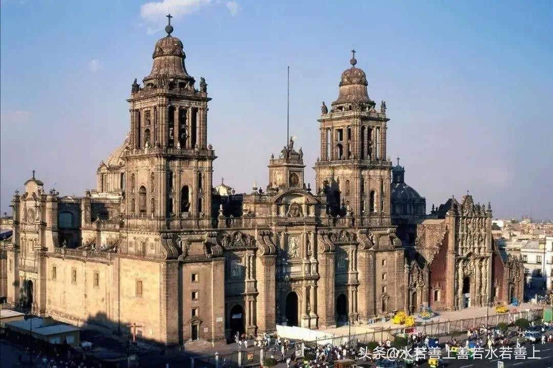 墨西哥大教堂始建于1573 年,1823年落成,是墨西哥最主要和最大的天主教堂,也是美洲著名教堂之一。墨西哥大教堂由灰色沙质石料和玄武岩砌筑的巨大建筑物而成。大教堂的正面糅合了多种不同的建筑艺术风格,给人庄重与和谐的感觉,高耸的塔楼是新古典派建筑风格。大祭坛有典型的文艺复兴式圆形拱顶覆盖,拱顶上有许多装饰华丽的浮雕绘画。