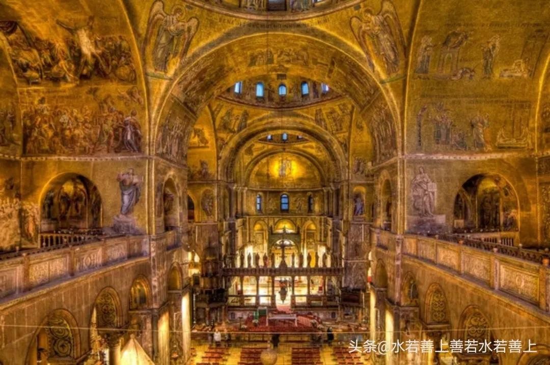 意大利威尼斯圣马可大教堂始建于829年,重建于1043~1071年,因埋葬了耶稣门徒圣马可而得名。大教堂曾是中世纪欧洲最大的教堂,是威尼斯建筑艺术的经典之作,同时也是一座收藏丰富艺术品的宝库。大教堂是东方拜占庭、古罗马、中世纪哥德式和文艺复兴多种艺术式样完美的结合体,无与伦比,美不胜收。教堂被列入《世界遗产名录》。