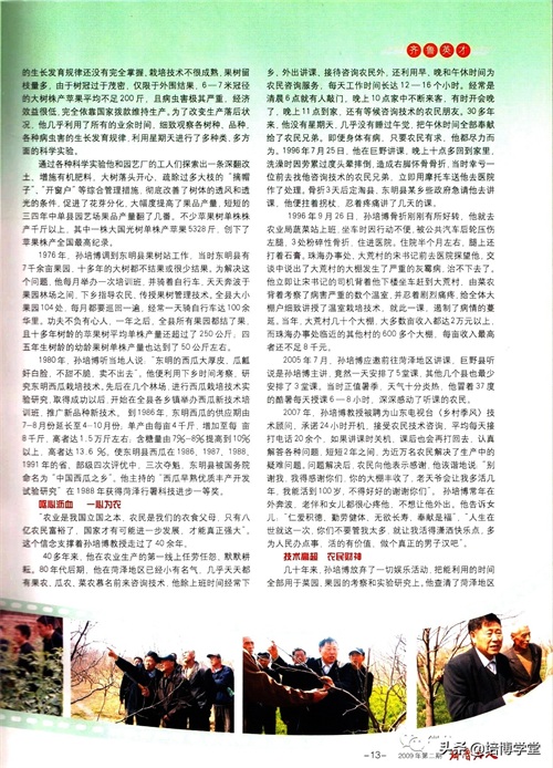 他不是劳动模范,不享受国务院特殊津贴,却每天耗费12—15小时为广大农民致富殚精竭虑、辛勤工作。他年近古稀,仍然每天接打几十个电话,为从不相识的农民排忧解难。每年离家外出200—300余天,经常一天坐车十多个小时去外省,不辞辛苦地为农民传授农业技术,每天讲课4—5个小时,有时讲课达7小时以上。自2005年至今,他先后赴15个省{直辖市}、150多个县(市)义务讲课1千余场次、培训农民近5万余人次。他40多年来默默无闻、无怨无悔,精心钻研、辛勤耕耘,为国家、为人民做出了突出贡献。同事赞他为“吾辈楷模、良师益友”,果农、菜农称赞他为“科技扶贫之花”、“致富金钥钥匙”、“农民的财神”。