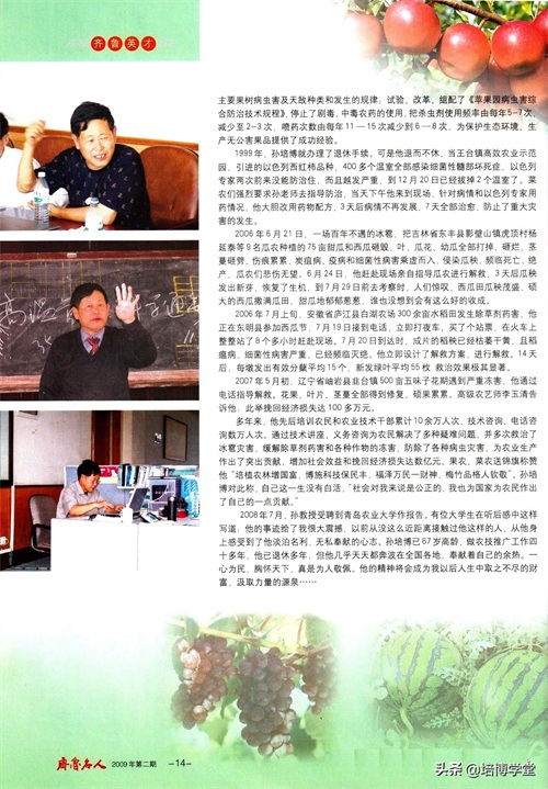 孙培博,一个最基层的农业技术工作者,他不是科技拔尖人才,却指导菜农创造了温室栽培黄瓜、番茄亩产6万斤以上、茄子亩产5万斤以上的高产记录。指导果农西瓜创出西瓜亩产7500公斤以上、设施蔬菜亩产3万公斤左右的国内最高产量。设施葡萄 6月份定植,翌年5月份亩产葡萄3千公斤左右、11月份产二次果1.5千公斤左右,开创了葡萄设施栽培快速增收之路。