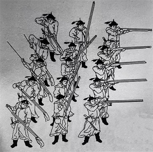 Because of the interval between shots soldiers had a strategy when using niao chong. Seldom, if never, it was used as single, often in groups, one group coming up to shoot while the other group was back to load. This guaranteed continuous shooting without break. Soldiers either stood or were on one knee to shoot. Unlike crossbow soldiers who, in order to save time, had a shooter, a loader and a deliverer to work as a team, each niao chong was operated by one soldier only. This was to avoid accidents when the firearm was changing hands.