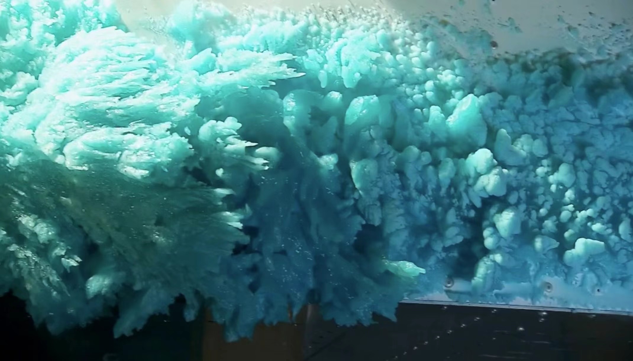 然后接下来就是测试另一种慢慢排放的情况,还是相同的操作,启动风扇释放蓝色液体,结果出乎意料。不到两分钟的时间,液体迅速结冰,看起来怪好看的,像这种慢慢流露的液体并不会受到风速影响,这种现象就叫做附面层保护效应。随之时间的推移,蓝冰在慢慢变大,不得不说这蓝珊瑚还怪好看的,就类似于风化,20分钟后,蓝冰直径达到了25厘米,但此后就没有在慢慢变大,因为随着冰块变厚,就不在附着与飞机表面了,也就失去了附面层保护,那么这么大块的冰块会不会掉下来呢?随着飞行器的下降,温度在慢慢升高,硕大的冰块在慢慢脱落,毫无疑问蓝冰坠落也就是时间问题而已,不出意外的话肯定不出意外,当温度下降至7度时,整一个蓝冰突然掉落,实验结果很明显流言被证实。