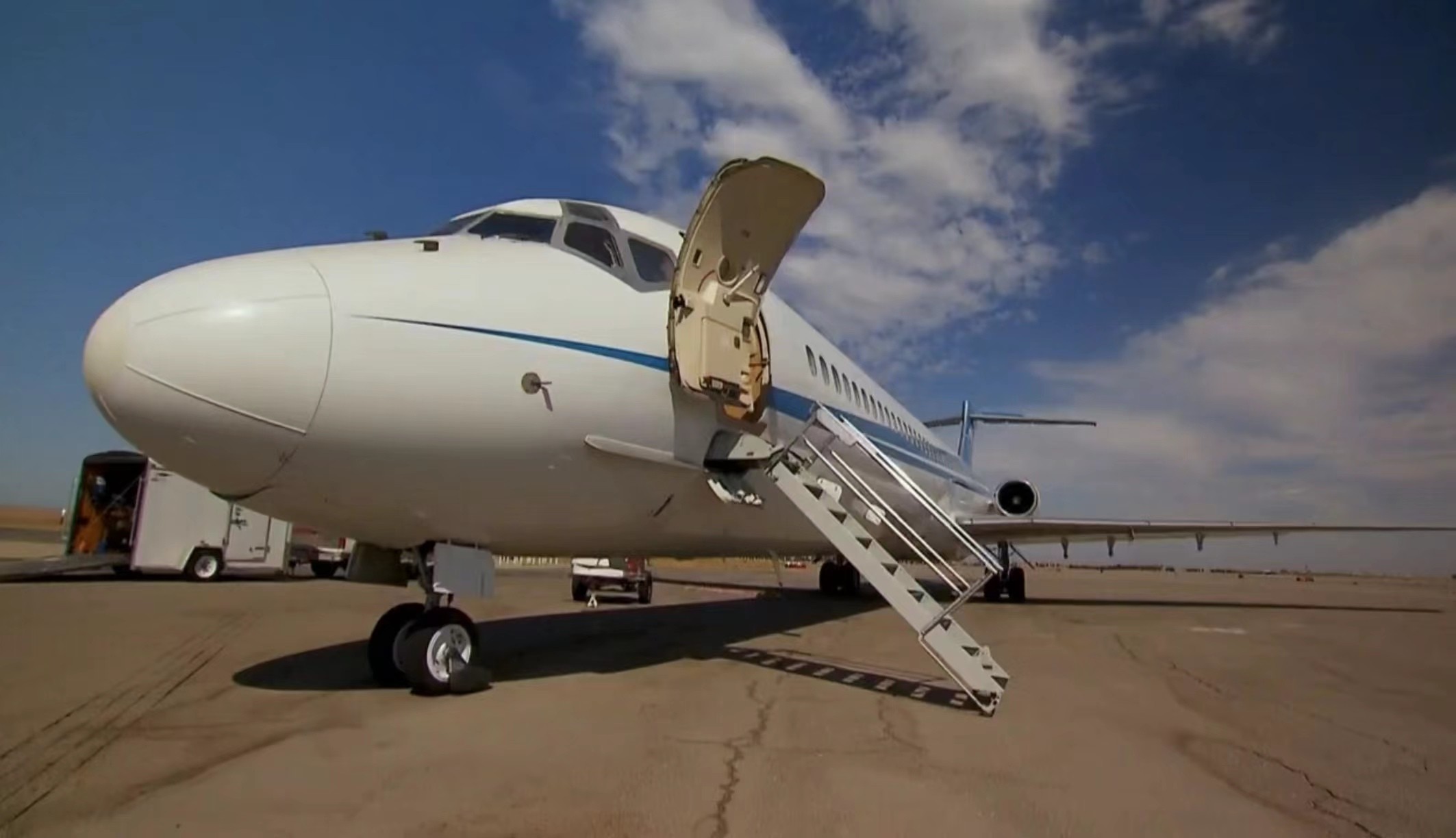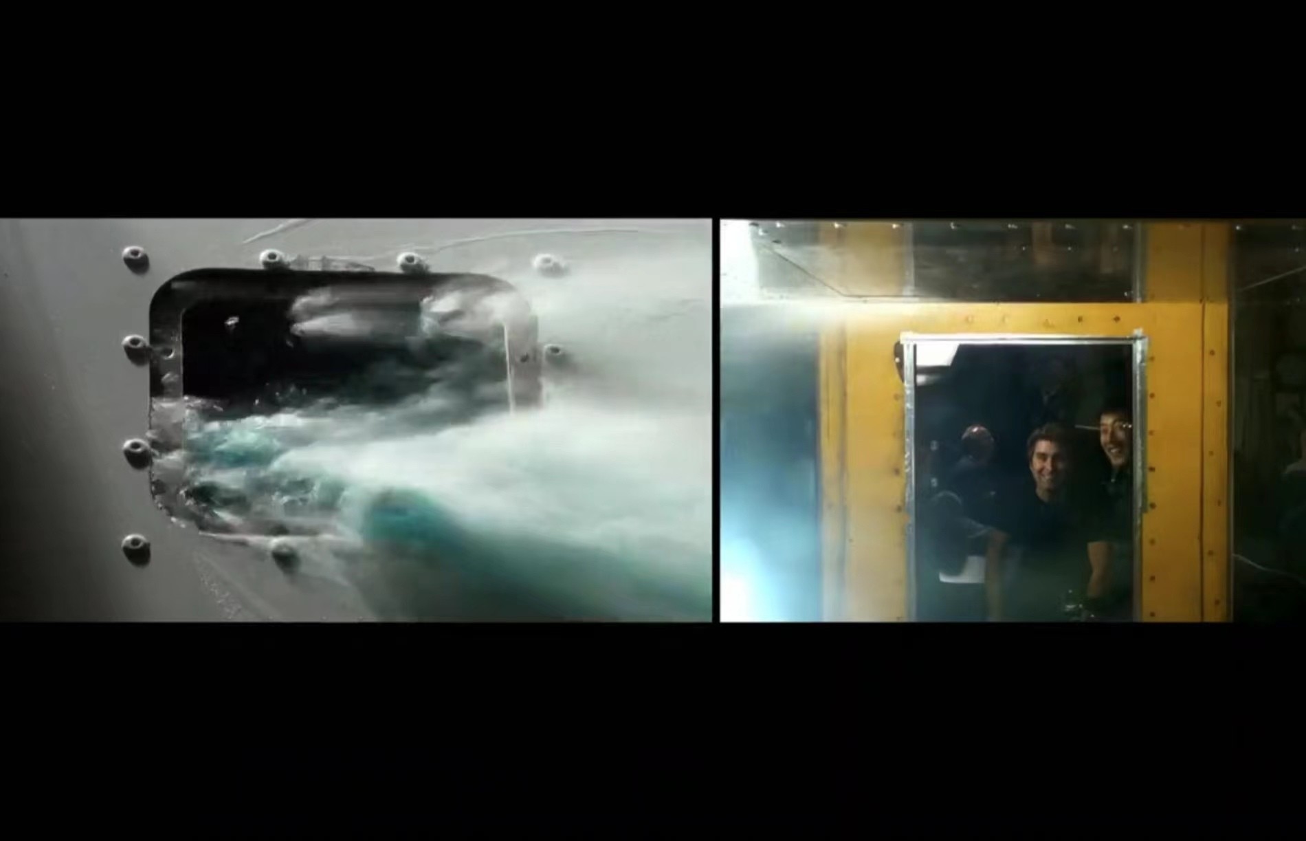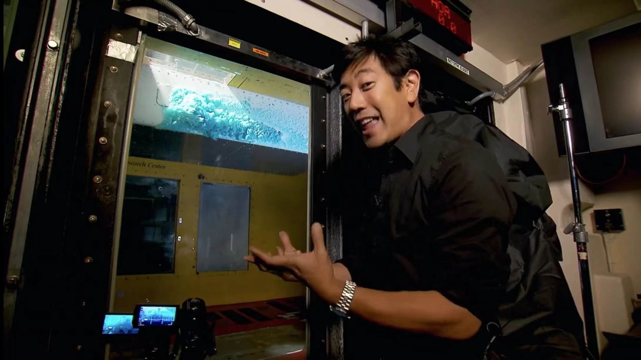 那么这种故障真的会让泄露物变成蓝冰吗?为了一比一还原流言场景,于是格兰利用超能力整来了去美国航天实验室做实验的机会,因为他那里的设备可以模拟出零下20度的低温,以及风速要求。但由于飞机不是谁想借就能借的,于是他们只能手动制作一个飞机模型,为了迎合流言,他们在一侧留有一个排泄口,并将其安装上水箱,他们计划测试慢慢泄露和喷涌而出两种情况,那么在如此情况下飞机泄露物真的能结成冰吗?一切准备就绪后他们来到航天控制室进行冰冻实验,然而本次实验的主要设备,就是眼前这台直径约为7.6米的大型风扇,它拥有5000马力的动力,并且拥有12片特制的独立叶片,他能够制造出每小时555公里的风速,由这台设备提供动力。温度会迅速降到零下。将提前准备好的飞机模型放进实验室,他们首先测试的是将水喷涌而出的实验,启动大型风扇,强劲的动力不一会儿就将温度降至零下20,然后释放蓝色液体,当液体被释放后,强大的风速迅速将其吹走,水花四溅,但遗憾的是尽管温度很低,但并没有形成传说中的冰块。通过高速摄像机发现,大部分的蓝色液体与风接触后瞬间气化,只有部分形成了薄冰,与流言所说的相差甚远。