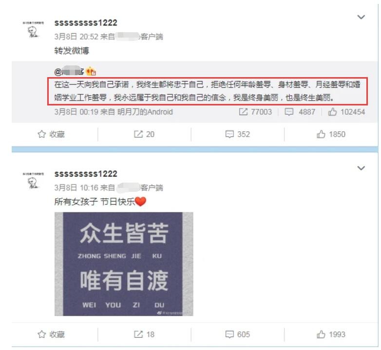 而第二条动态是点赞转发了他人微博的一段话:“在这一天向我自己承诺,我终生都将忠于自己,拒绝任何羞辱,我永远属于我自己和我自己的信念!”如果此小号真是出自郑爽之手,那么从郑爽的此次表现来看,疑似在暗中蓄力等待反击的时刻。毕竟,以郑爽以往在圈内的性格,她是不会这么轻易认输的一个人。