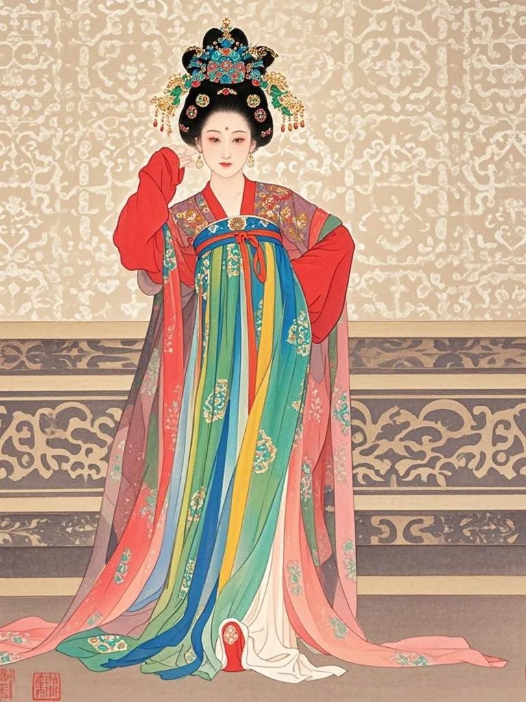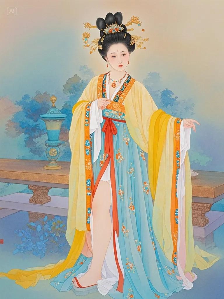 唐代仕女在艺术风格上,仕女图中的人物形象大多颜色饱满厚重,线条遒劲有力,造型生动自然,呈现出雍容富态的特点,以丰肥为体,体现了唐代的特殊审美。画家注重人物神态的刻画,使仕女们或优雅、或慵懒、或惆怅的神情跃然纸上。在构图方面,人物安排高低错落、富有节奏感与和谐感,画面富有留白的同时,视觉纵深感得以展开。唐朝仕女图不仅是艺术珍品,更是研究唐朝服饰、发饰、社会习俗的重要史料。