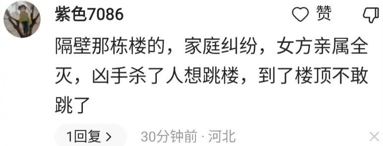 随后就有知情人曝光了原因,有一位地址是河北的网友称,是隔壁那楼的,家庭纠纷,女方亲属全灭,凶手杀了人想跳楼,到了楼顶却又不敢跳了。